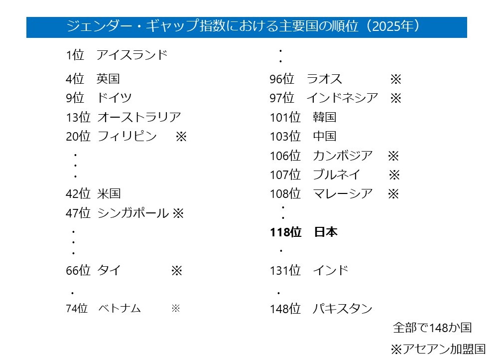 この表は、スイスの民間団体ワールド・エコノミック・フォーラムによって公表された2025年世界ジェンダー・ギャップ指数の順位表の抜粋である。これによれば、日本は順位表に掲げられている148国中118位に位置付けられている。アセアン各国との関係で言えば、10か国のうち、9か国がいずれも日本より上位であるとされ、残る1か国であるミャンマーについて、現在の政治状況にかんがみて評価の対象とはされなかった。