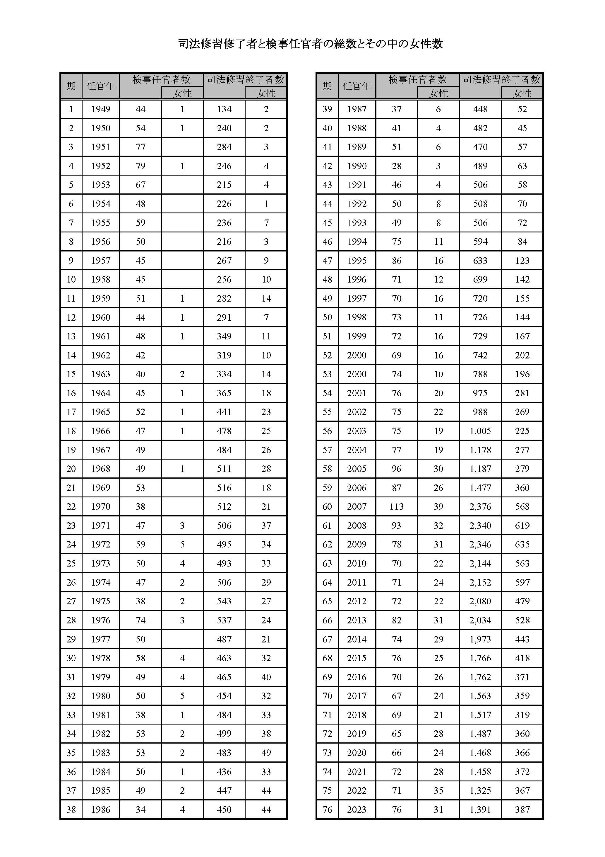 近年の数字を見ると、2023年の第76期においては、司法修習修了者1391名でそのうち女性は387名、検事任官者は76名で女性は31名であった。