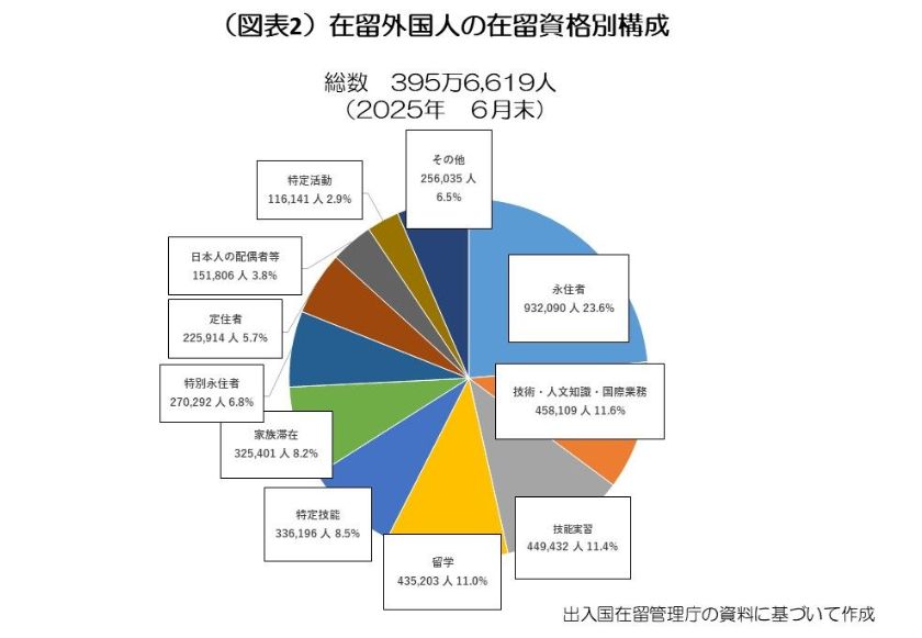 在留外国人を在留資格別に見ると、本年6月末の時点で、永住者(その許可のためには10年以上在日することや日本語能力等の要件あり)約93万人、技術・人文知識・国際業務(ホワイトカラー職)約46万人、技能実習(送出国を支援する目的で、日本におけるスキル習得を目指す)約45万人、留学約44万人、特定技能(日本における人手不足分野毎にそこでの即戦力となりうる外国人を受け入れるもの)約34万人、家族滞在(他の資格で在留する外国人の家族)約33万人、特別永住者(在日韓国人等)約27万人、定住者(3世以内の日系外国人等)約23万人、日本人配偶者等約15万人、特定活動(多数の類型がある)12万人などとなる。